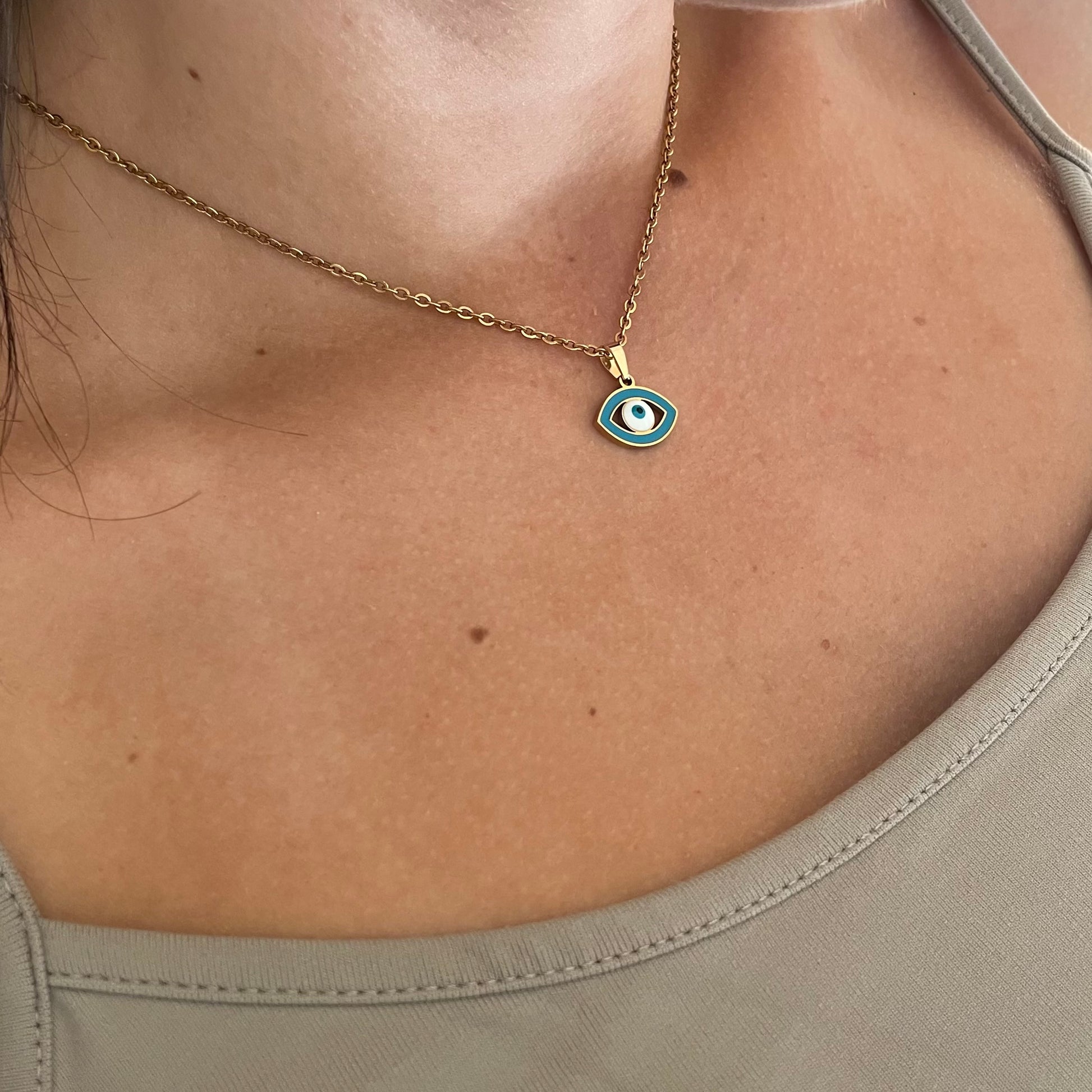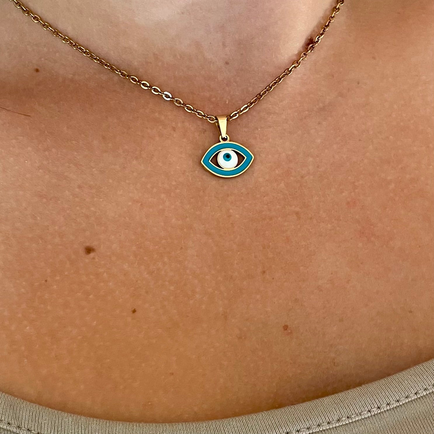 This beautiful necklace features an almond-shaped evil eye charm, delicately suspended from a matching chain. The pendant is crafted from vacuum plated 201 stainless steel with real 18K gold plating, and filled with a smooth blue enamel backdrop. At its center sits a traditional evil eye design in white, turquoise, and black — a powerful symbol of protection and spiritual clarity.