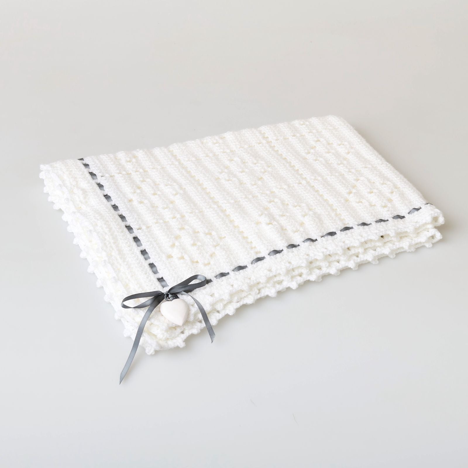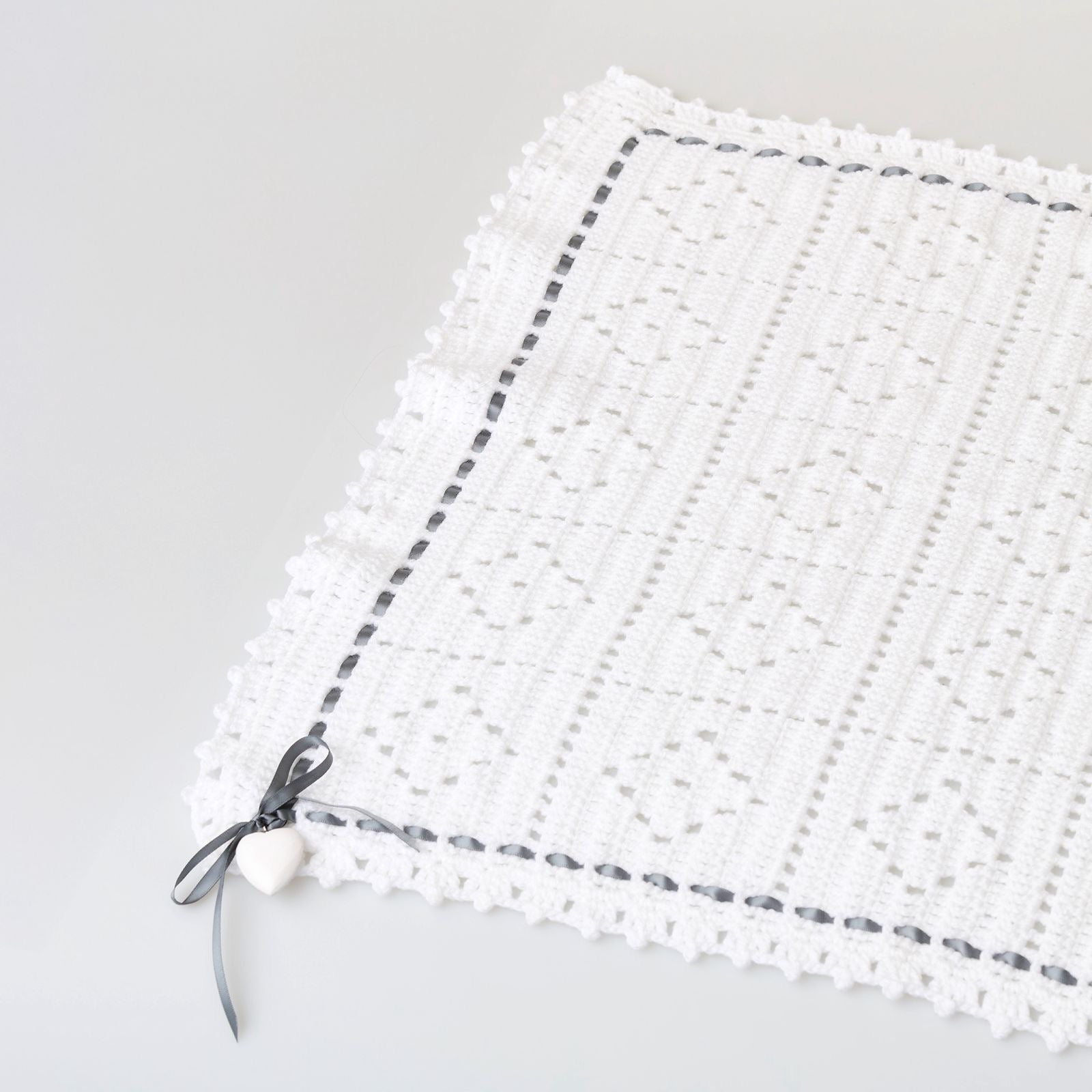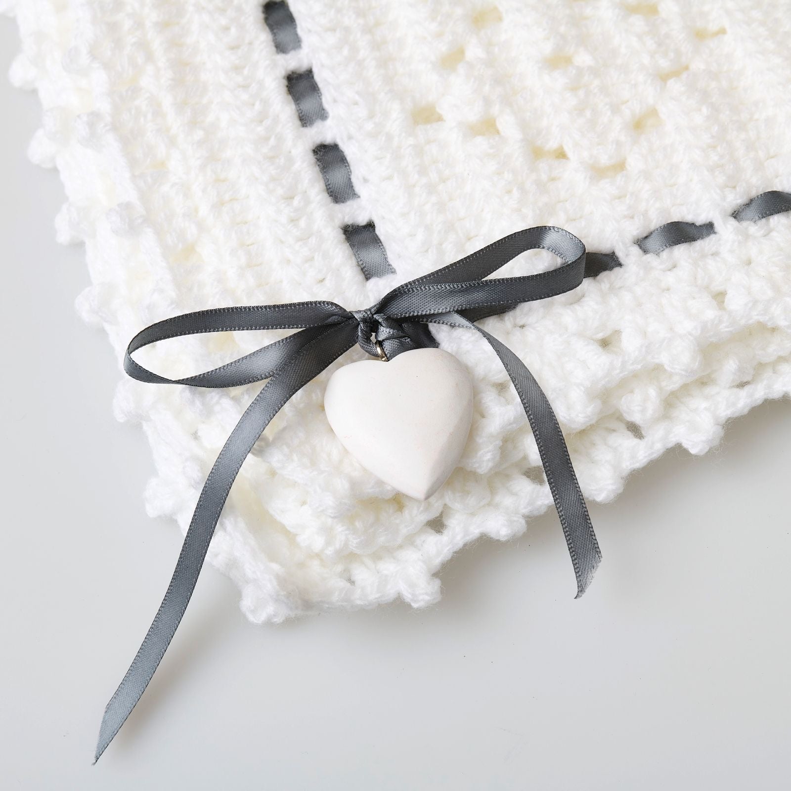 • Design: Timeless crochet pattern with delicate ribbon detailing and an optional heart charm for a unique, elegant touch. Available in white, baby pink, and baby blue.