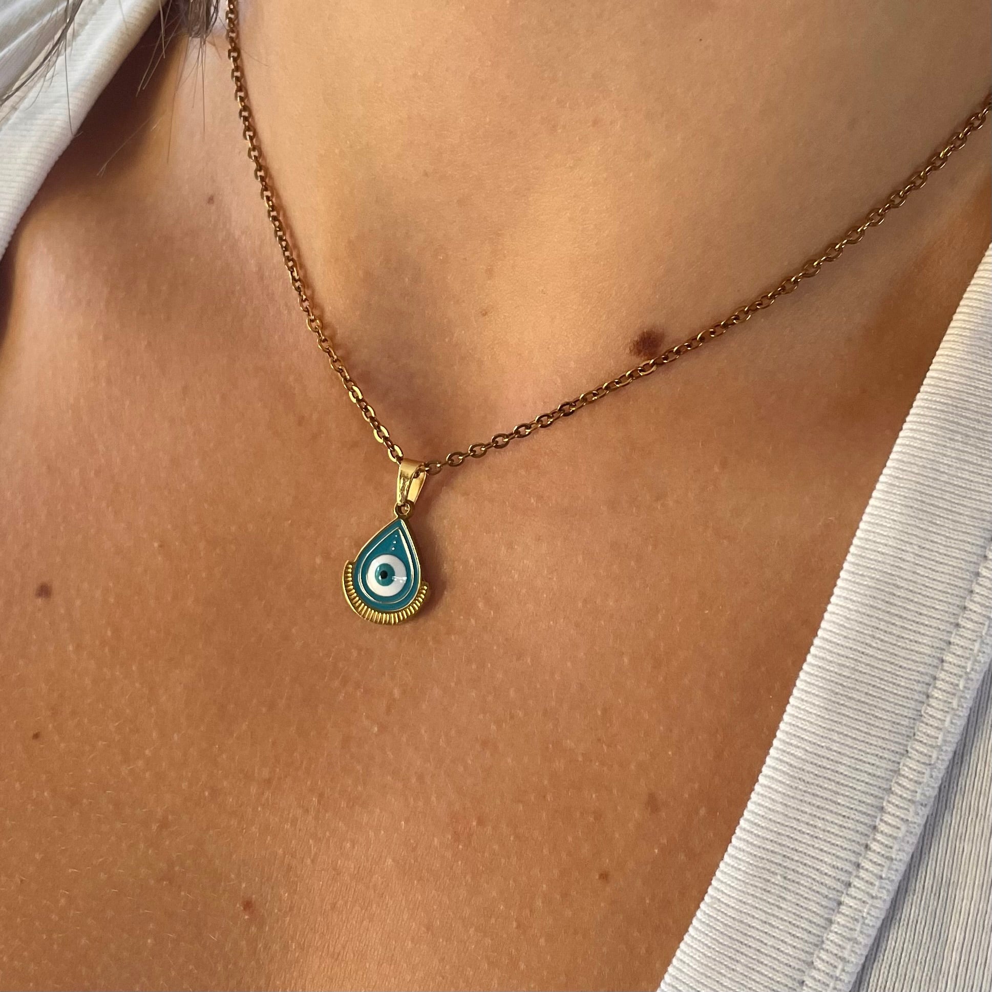 This striking necklace features a teardrop-shaped evil eye charm, delicately suspended from a matching chain. The pendant is crafted from vacuum plated 201 stainless steel with real 18K gold plating, and filled with a smooth blue enamel backdrop. At its center sits a traditional evil eye design in white, turquoise, and black — a powerful symbol of protection and spiritual clarity.