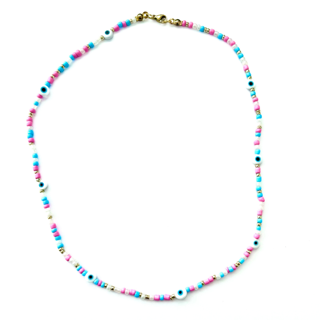 Beaded Necklace - Pink/Blue/White