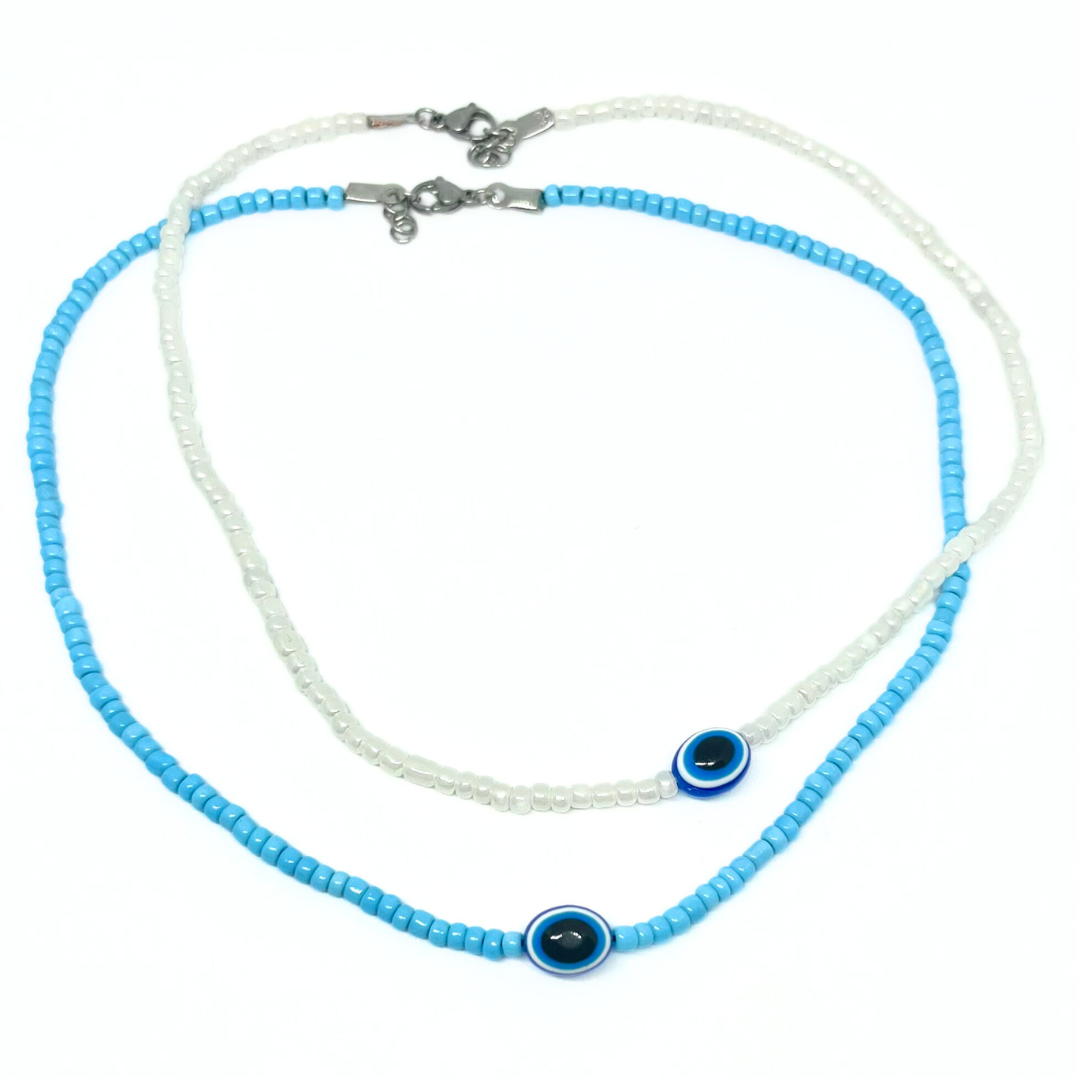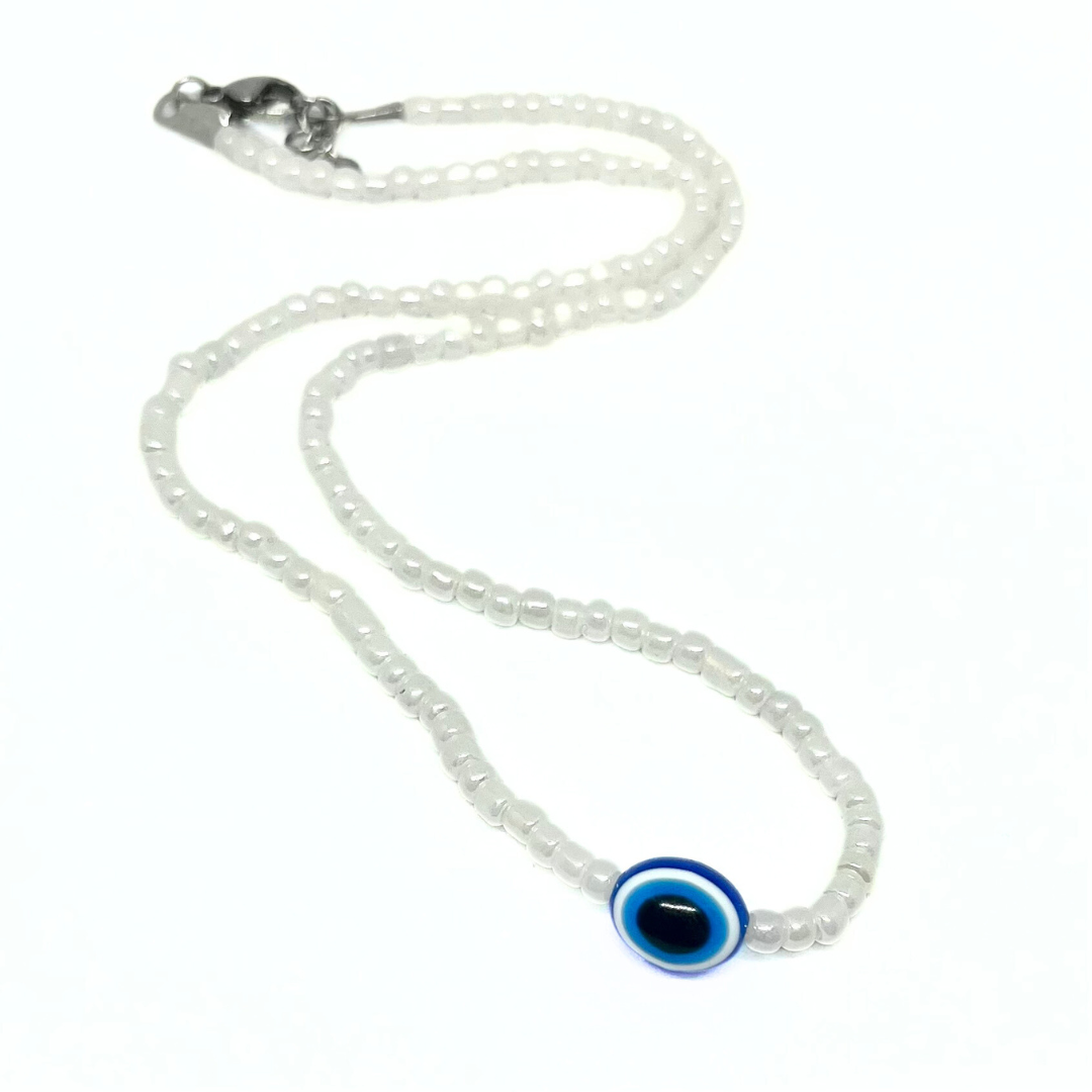 This exquisite beaded necklace boasts a stunning oval evil eye pendant, believed to protect its wearer from harm. Handcrafted with meticulous attention to detail, it adds elegance and charm to any outfit. A timeless piece that is sure to make a statement.
