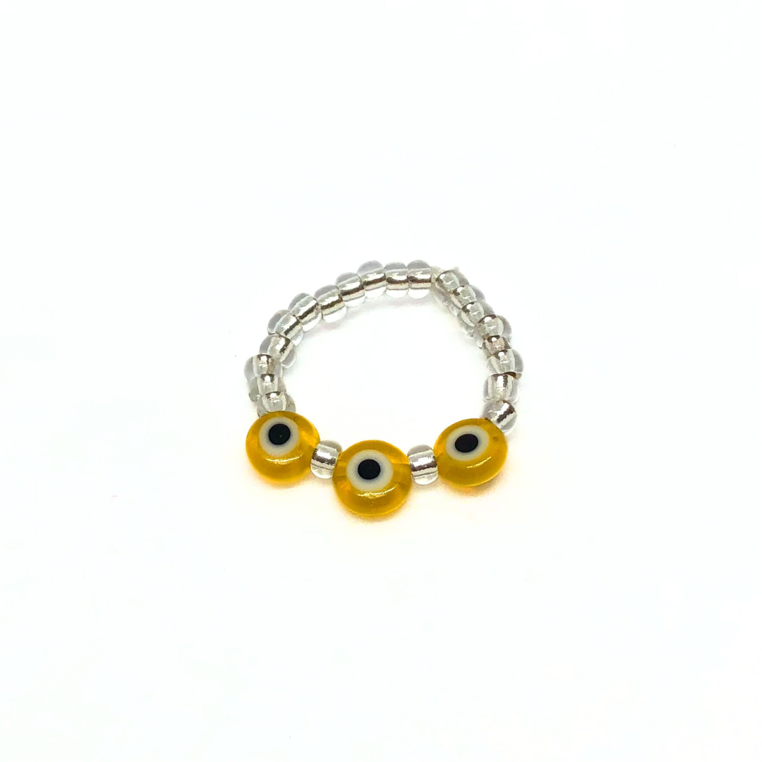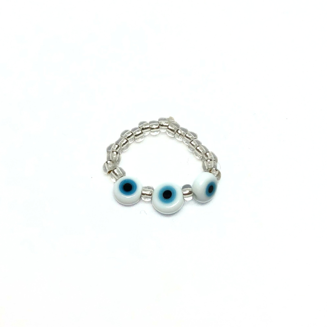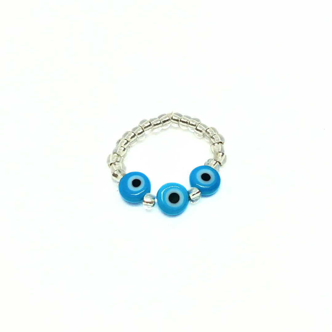Protect yourself from bad vibes with this playful beaded ring featuring multi blue evil eyes. The elastic band ensures comfort and flexibility for everyday wear.