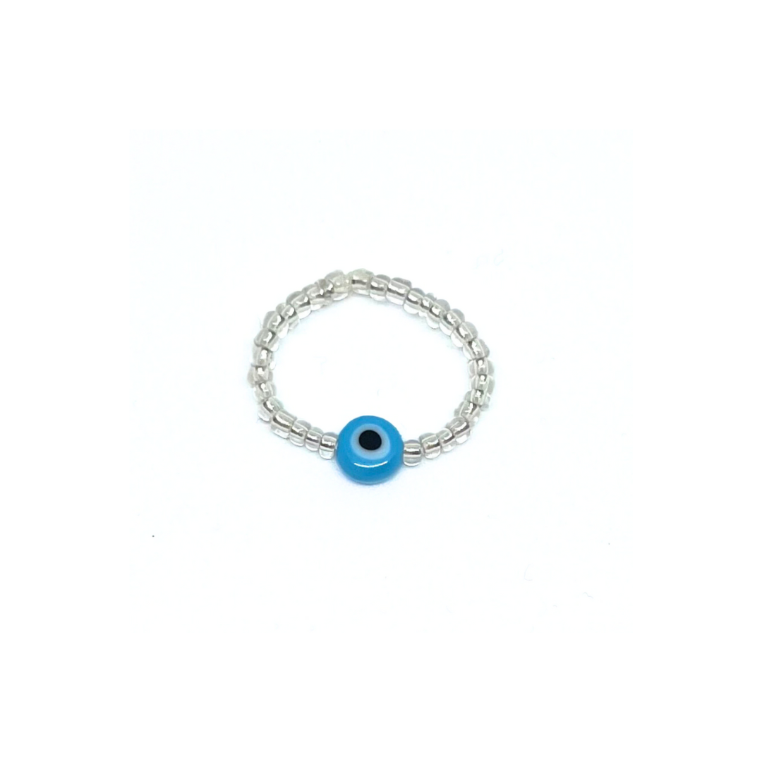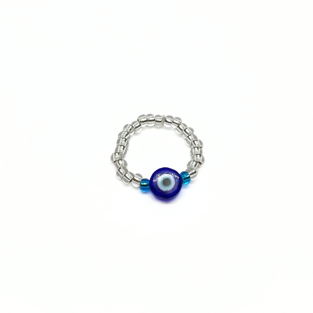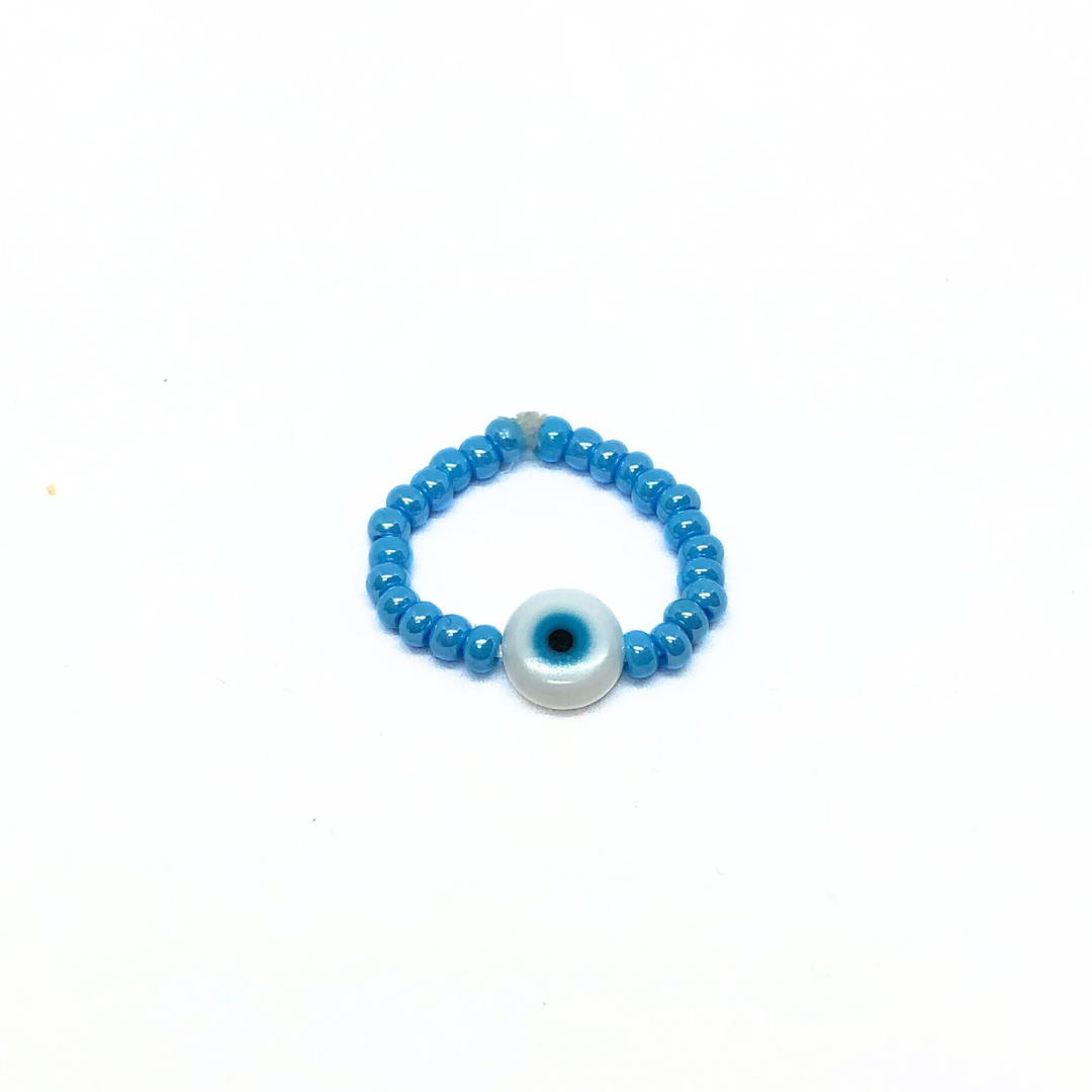 Protect yourself from bad vibes with this playful beaded ring featuring multi blue evil eyes. The elastic band ensures comfort and flexibility for everyday wear.