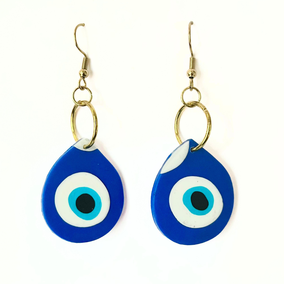 Handmade polymer clay teardrop with evil eye pattern, set on gold ring and diamanté stud