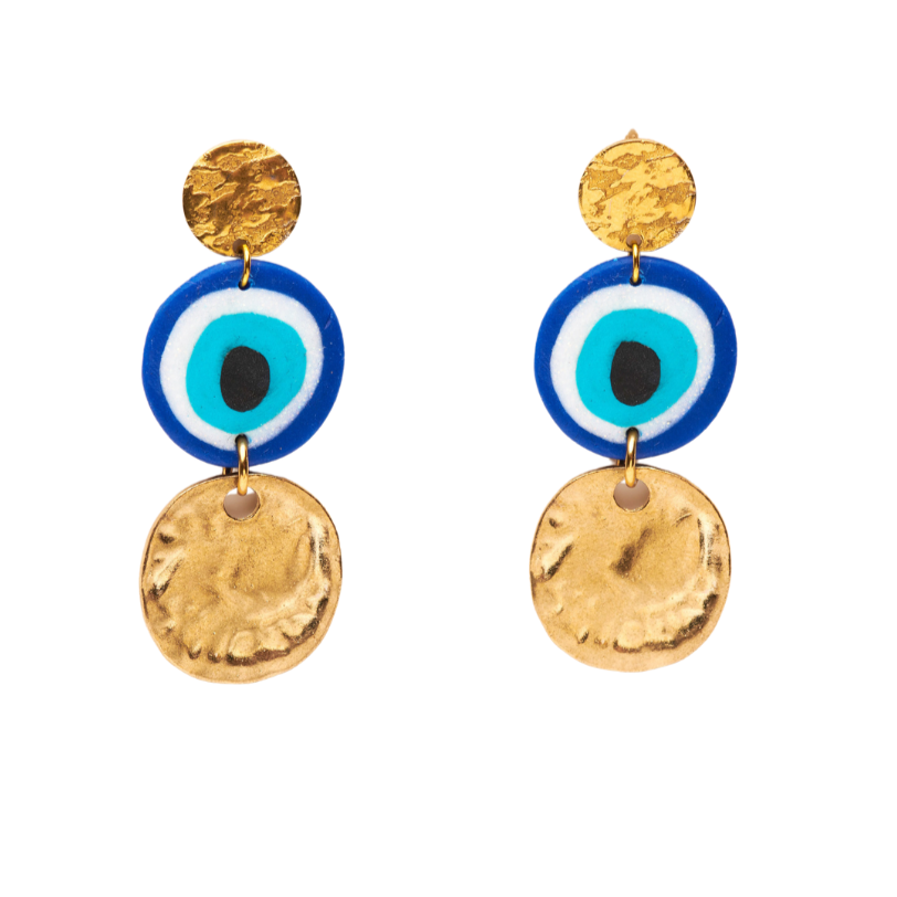 Handmade polymer clay evil eye set on a textured ion-plated stud and 304 grade stainless steel finding, with large round pendant.