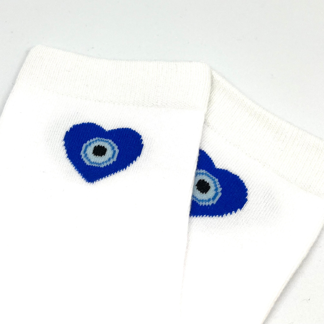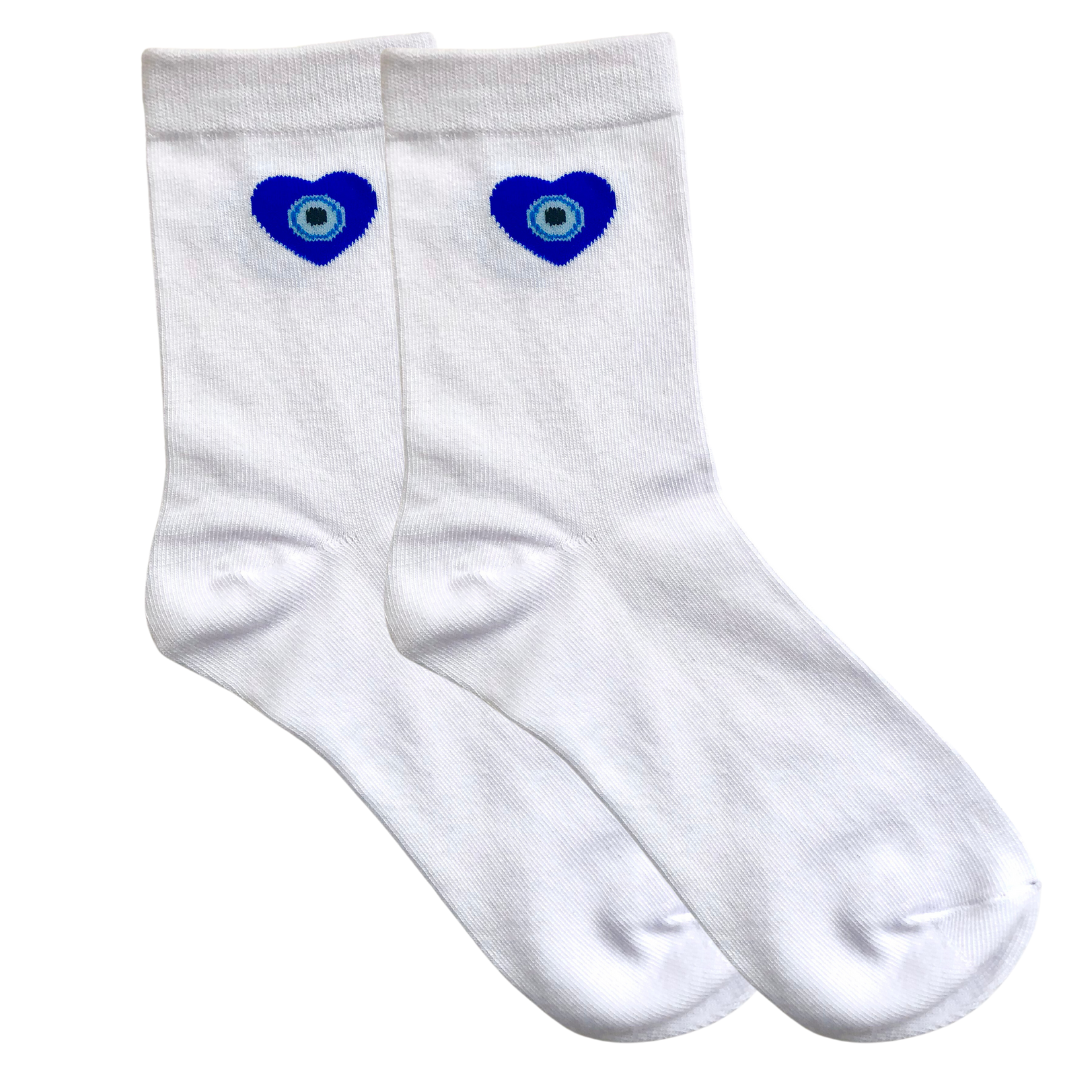 Add a little love to your look with these Heart Mati Socks. Featuring a heart-shaped evil eye design, these socks will provide protection from bad vibes and cold feet with a fashionable twist! Plus, they look totally sweet when peeking out of your favorite shoes. All the protection, none of the frump!